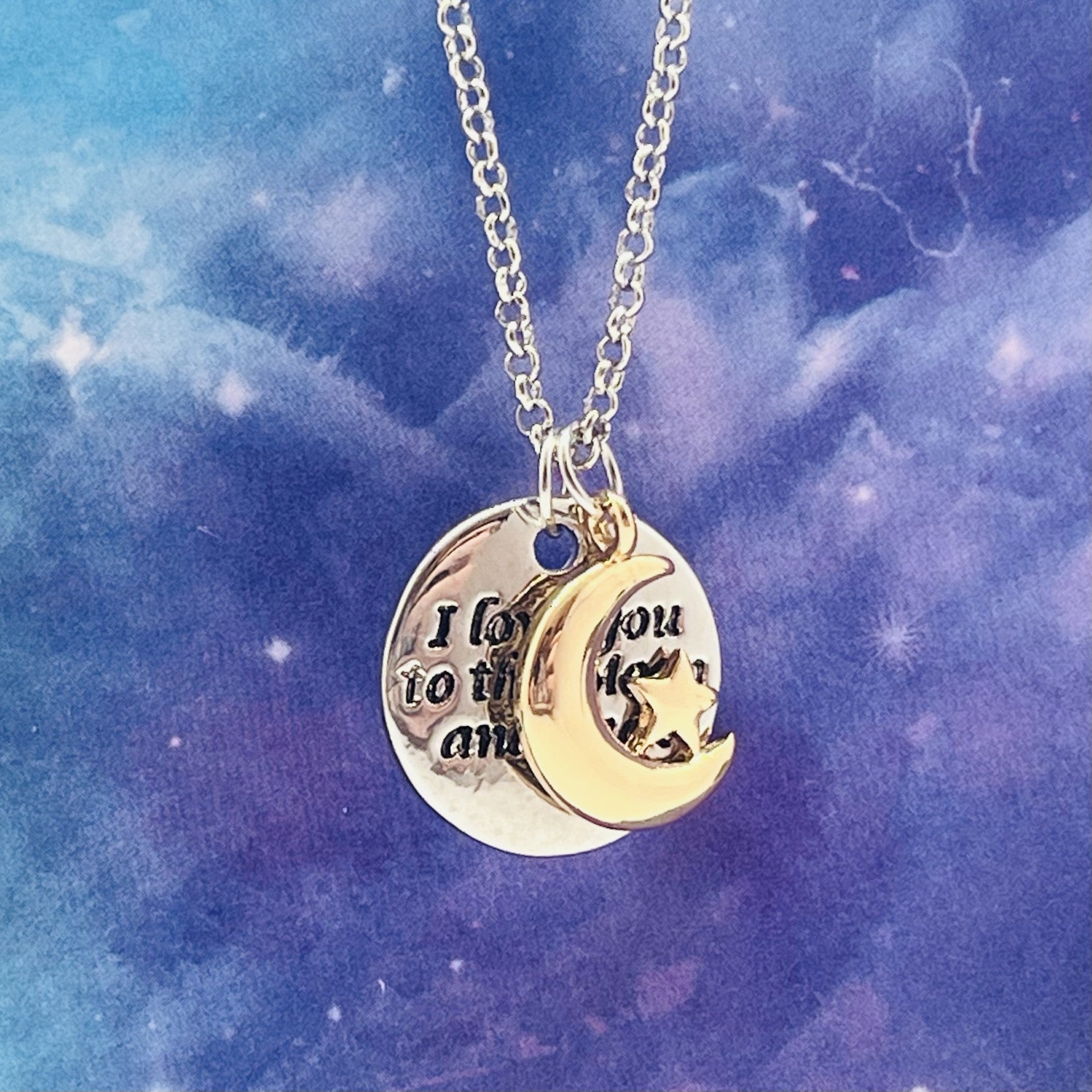 These "I love you to the Moon and back" and Moon with Star Necklaces feature a double pendant that allows for the moon and star to overlap the "I love you to the Moon and back" pendant.