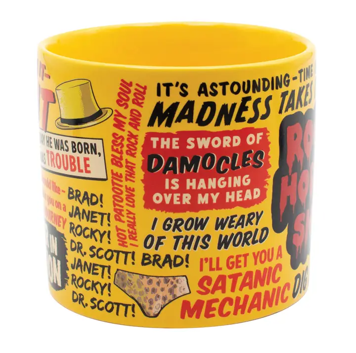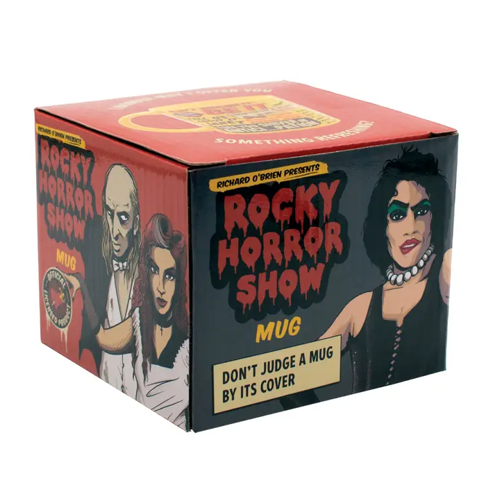 Featuring dozens of quotes and images and a certain naïve charm suitable for your everyday strange journey. All this comes in an attractive gift box featuring Brad and Janet, Eddie, Riff Raff, Magenta …and Dr Frank N Furter, himself. At last. 14 oz. Perfect for any hot beverage: coffee, tea, hot chocolate, pumpkin spiced beverage.