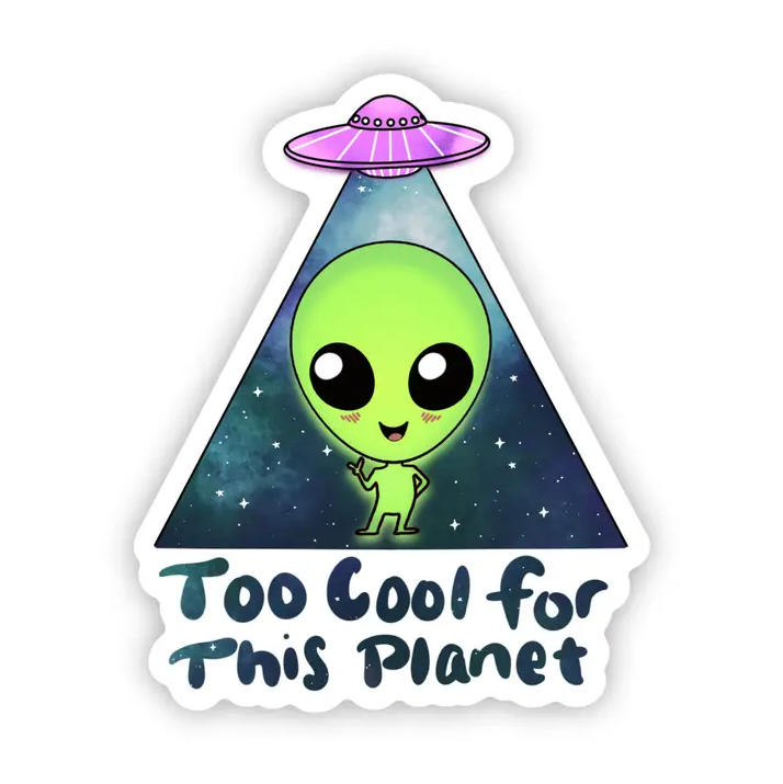 This green alien and purple spaceship is "Too cool for this planet". Great to decorate water bottles, laptops, phone cases, coolers, car windows, journals, notebooks, planners, bikes, skateboards, kayaks, and more.